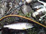 本流の落ち込みあたりで、イワナが激しくチェイス。良型一匹ゲット